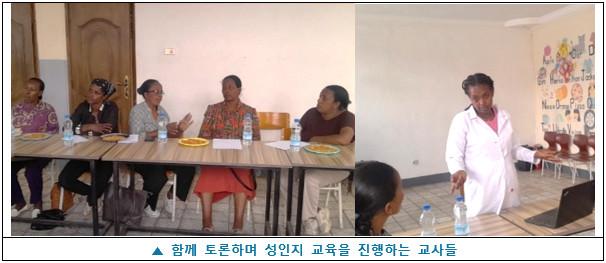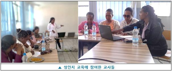 11월에는 교사 대상 별도의 성인지 교육도 진행되었습니다. 이번 교육은 성매개 감염병, 자궁경부암, 생식 위생에 대한 인식을 높이고, 특히 학교에 재학 중인 여학생과 청소년들을 대상으로 올바른 건강 정보를 전달하기 위해 진행되었습니다. 이번 교육은 지역 보건소 간호사인 Sr. Embet Legesse의 자기소개와 활동 배경 설명으로 시작되었습니다. 참석한 교사들은 강의 형식에 더해 소그룹 토의, 자기 점검 활동 등 다양한 참여형 방식을 통해 내용을 함께 나누며 이해를 높였습니다.