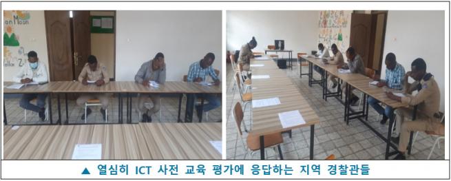 문화에 따라 지역 경찰관들에게 컴퓨터 기술 교육을 제공할 수 있게 되었습니다. KVO에서는 기초 ICT 교육을 실시하기 전 교육에 참여하는 경찰관들의 컴퓨터 역량 단계를 알아보고자 사전 평가를 진행하였습니다. 평가는 12개의 컴퓨터 관련 객관식 문제와 5개의 실습 문제가 포함되었습니다. 실습 문제는 글자 크기와 색 바꾸기, 글자 진하게 하기, 글자 복사 붙여넣기, 문서 프린트하기, 컴퓨터에 문서 저장하기 문제로 구성되었습니다. 필기 평가의 평균 점수는 12점 만점에 6.125점으로 높았으나, 실기 평가의 평균 점수는 5점 만점에서 0.5점에 그쳤습니다.