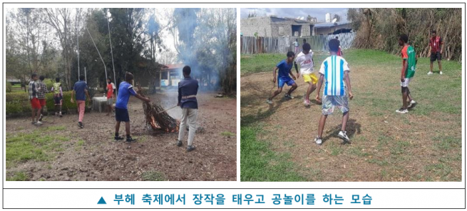 8월 19일에는 Buhe(부헤) 행사가 진행되었습니다. 이번 행사는 KVO 직원들과 학생 20명이 참여해 따뜻한 교류의 시간을 보냈습니다. 행사는 Mr.Biniam 선생님의 개회사로 시작되었으며, 이후 전통적인 부헤 축제 노래와 함께 ‘치보’ 장작을 태우는 의식이 진행되었습니다. 함께 즐겁게 진행된 행사는 ‘물물’ 전통 빵을 나누는 시간으로 마무리되었습니다.