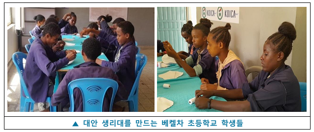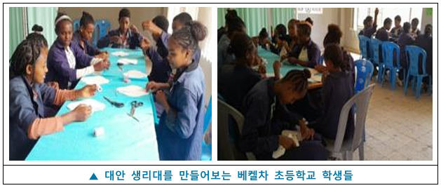 교육은 에티오피아 여학생들의 교육권과 건강권을 보장하기 위해 진행되고 있습니다. 방수천이 포함된 대안생리대는