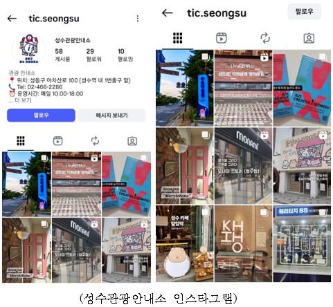 성동구 성수관광안내소 KVO통역안내자원봉사 활동과 관련하여 성수동을 알리는 관광 홍보를 위하여 성수동의 관광지 및 업체에 대한 소개 사진과 글을 성수 관광안내소 인스타그램에 올리는 SNS 홍보활동을 실시하고 있습니다